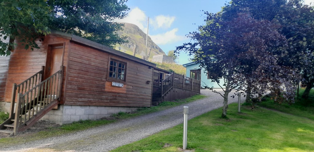 De blokhut herbergt een koffietentje, een kantoortje en een slaapkamer en belichaamt het tiny house dat ik ooit wil bouwen. Er staat een groot wit gebouw naast dat onderdak biedt aan 38 (ski)gasten en Tim en zijn vrouw Hrllen wonen zelf in de blokhut aan de andere kant van dat pand.