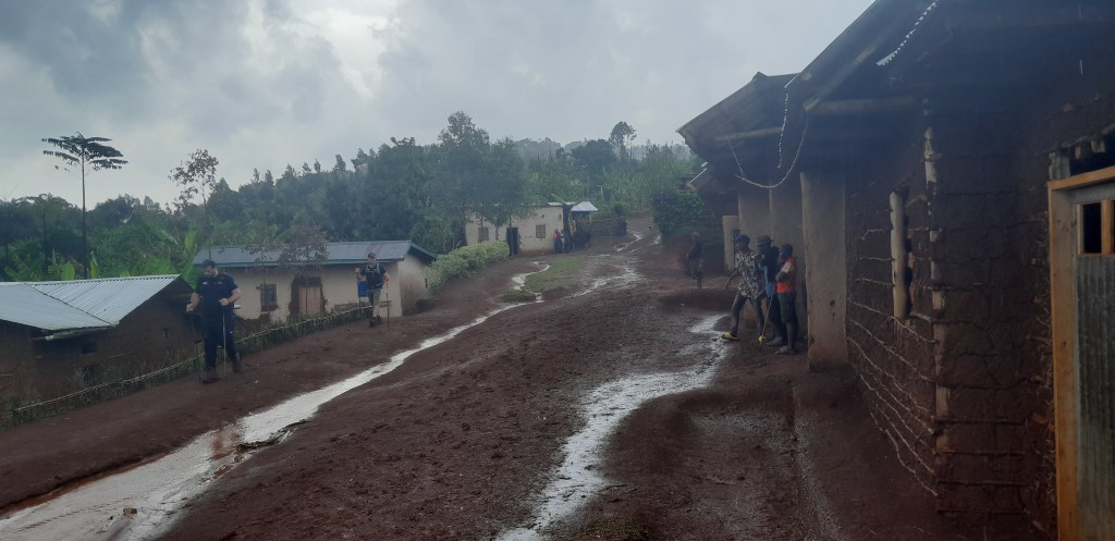 Verwarring. Waar is iedereen? Een gids blijkt met een groepje verdwaald en het duurt even voor iedereen weer terecht is. Wat gaan we doen? Terug of door? Het tempo is door de rode klei tot onder de twee kilometer per uur gedaald en we moeten nog tien kilometer. Het grootste deel van de groep wil door tegen de wil van hoofdgids Ceasar in. We mogen dan grote hutkoffers hebben en verwende kantoormiepen zijn, maar wij zijn hier voor één ding: lopen. En aldus ploeteren wij voort. Urenlang door glibberige blubber, zoekend naar kleivrije stukken in het gras.