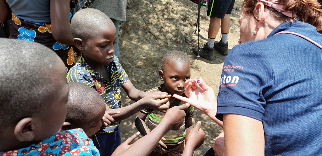 Overal de kleine kinderen in prachtige kleurrijke kleding. Mensen die op het land werken tonen een grote glimlach waarbij mooie witte tanden ons toeglimmen. Sommige kinderen zijn wat verlegen en terughoudend maar komen los als Sonja haar roze nagellak tevoorschijn tovert en naarstig kindernagels begint te lakken. Wat ook helpt is de potige tukker die door dorpen beent een oerendhard Amakuru brult, ofwel: Hoe is het!? Hele dorpen ontdooien en brullen vrolijk terug.