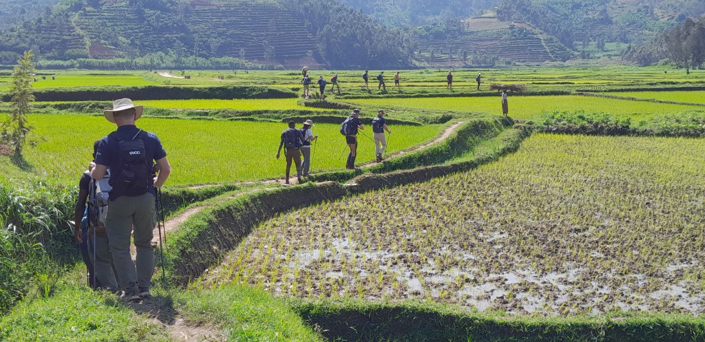 Onze eerste dag is meteen de meest bijzondere, onze vuurdoop. We trekken door een gigantische vallei met rijstvelden, maïsvelden en overal mensen die aan het werk zijn in kleurrijke gewaden. Alle stereotype beelden die we van Afrika hebben vertalen zich in die eerste uren in Instagram-foto’s.