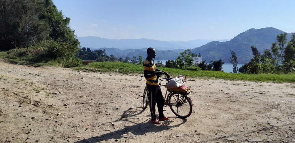 Na de zware dag van gisteren blijft het vandaag bij 16 kilometers. Dreigende onweerswolken doemen op maar waaien aan ons voorbij. We eindigen ons wild geraas op een schiereiland waar op het uiterste puntje een prachtige lodge ligt met tentenkamp, het Maravilla Kivu Eco Resort. Op het laatste stuk gravelweg hang ik regelmatig aan onze terreinwagens die langskomen en schiet foto’s van de groep. Aan de overzijde van het meer zien we Congo.
