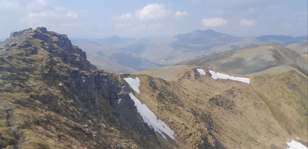 Totaal gesloopt kom ik op de zuidgraat aan waar de hellingsgraat afneemt. Het boekje zegt na 750 meter (afstand), maar bedoelt op een hoogte van 750 meter. Vanaf hier volgt een hele lange geleidelijke klim naar de eerste Munro. Deze lange bultrug van gras kon ik vanochtend helemaal zien liggen vanuit mijn tent dus ik weet precies hoe lang hij is. Lang!