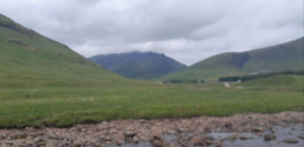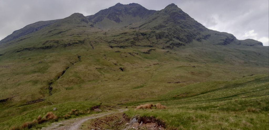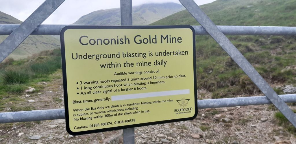 Na het bos volgt een lange vallei – de Glen Cononish – waarbij constant zicht is op de Ben Lui, een imposante kolos aan de einder. Ik passeer een goudmijn – dit kan alleen in Schotland – en er volgen waarschuwingen dat ze met alarmen duidelijk maken als er ondergrondse ontploffingen zijn. Even twijfel ik of de oortjes en muziek uitmoeten, maar ze zullen op zaterdag vast geen Munro Bagger laten ontploffen.