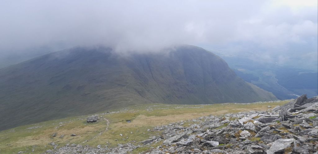 Ik laat de top links liggen want wil daar eindigen. Eerst daal ik 300 meter af naar een zadel om het broertje mee te pakken, een lagere weinig interessante pukkel. Positief is dat de wolken iets optrekken. Deze tweede top heb ik vrij zicht en als ik door het zadel terugklim naar de Ben Lui laat ook die zich zien, een imposante fucker.