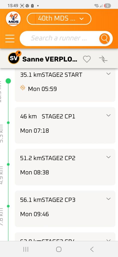 Ze zegt daarover dat het vandaag beter ging. Een hele mooie etappe met minder zandduinen en meer echte bergen. Ze heeft een klein blaartje laten behandelen. Door de gaiters die aan je schoenen zijn genaaid tegen het instuivende zand worden je voeten wat vochtiger en daarmee zachter. Daarentegen liggen er volgens Sanne al honderden mensen in de snijrent met veel ergere blaren.