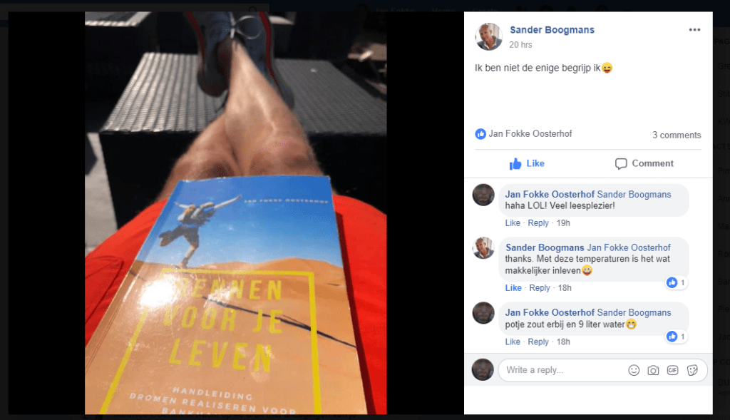 Bedankt voor de prachtige tekst. Ik heb van je boek genoten. Zowel door de handige tips als door je schrijfstijl. Ik heb in een deuk gelegen. Een heerlijk leesbaar boek over het volgen en realiseren van je dromen en vooral ook om zaken lekker realistisch te blijven bekijken in een tijd waarin alles wordt opgeklopt, opgeblazen en overdreven.